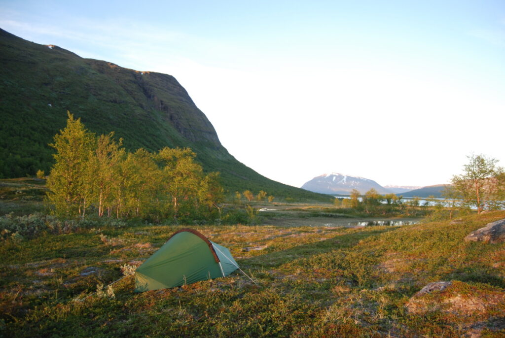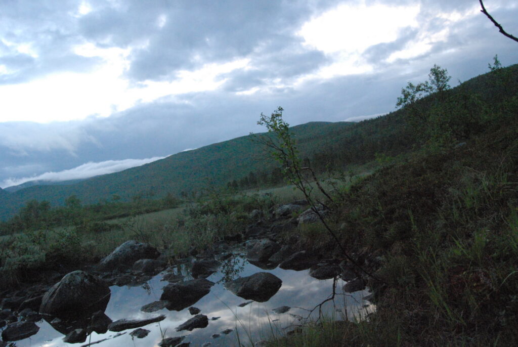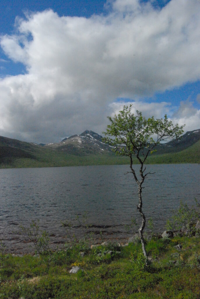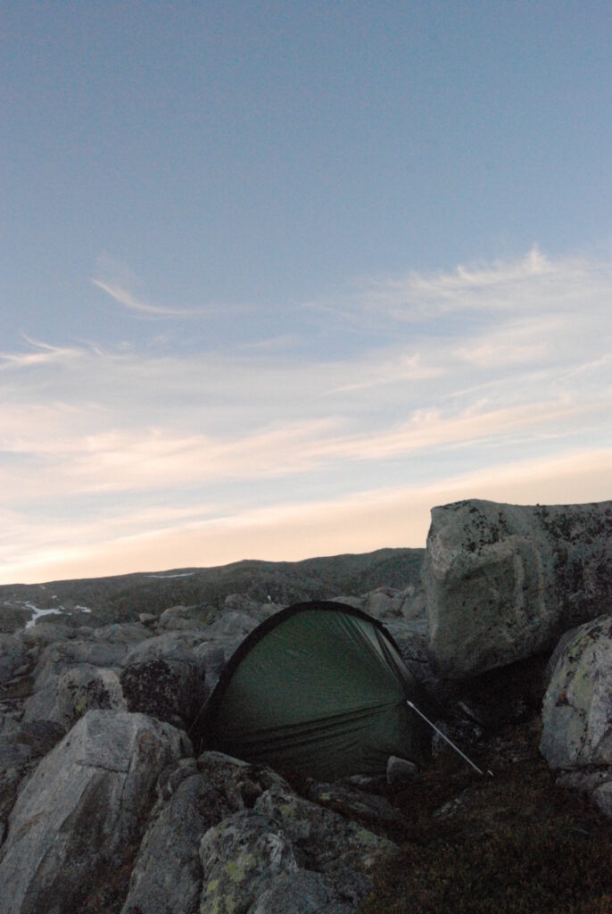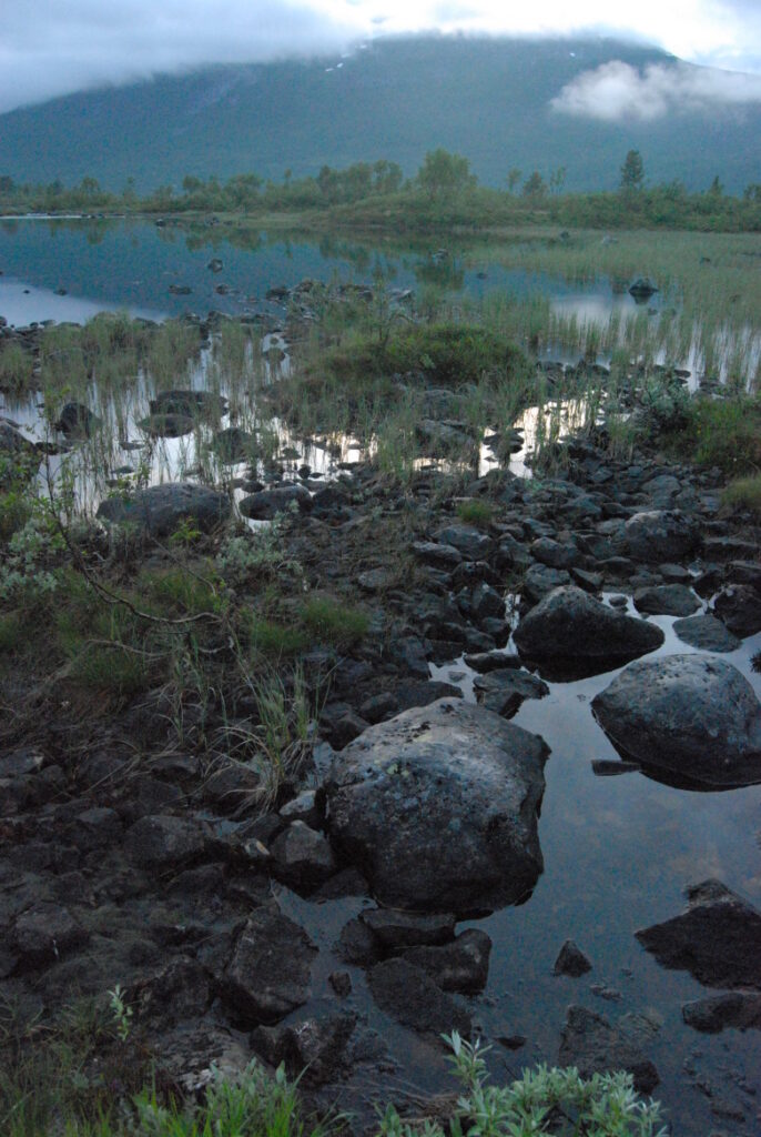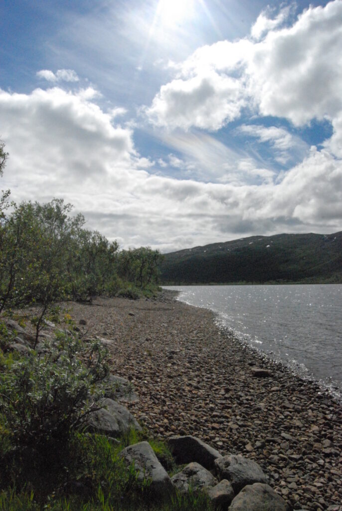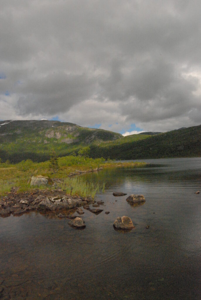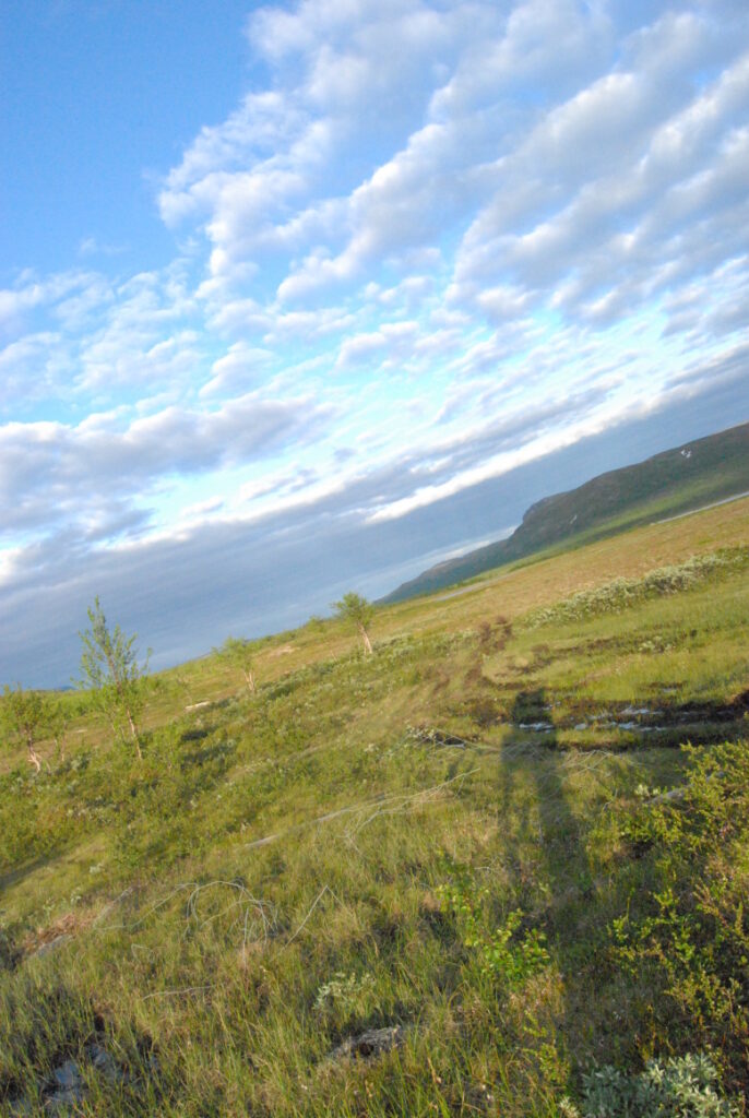 Le bus depuis Tromsø ne permet pas d’atteindre Innset, le point de départ du trek … trente kilomètres à parcourir moitié à pied moitié en stop! Il est encore tôt – vingt trois heures: je marche dix kilomètres avant de planter ma tente aux abords du lac, et la joie de découvrir en pleine lumière à trois heures du matin que les moustiques de dorment pas la nuit – il n’y a pas de nuit. Il est trois heures du matin et j’écris ce poème avant de m’endormir …