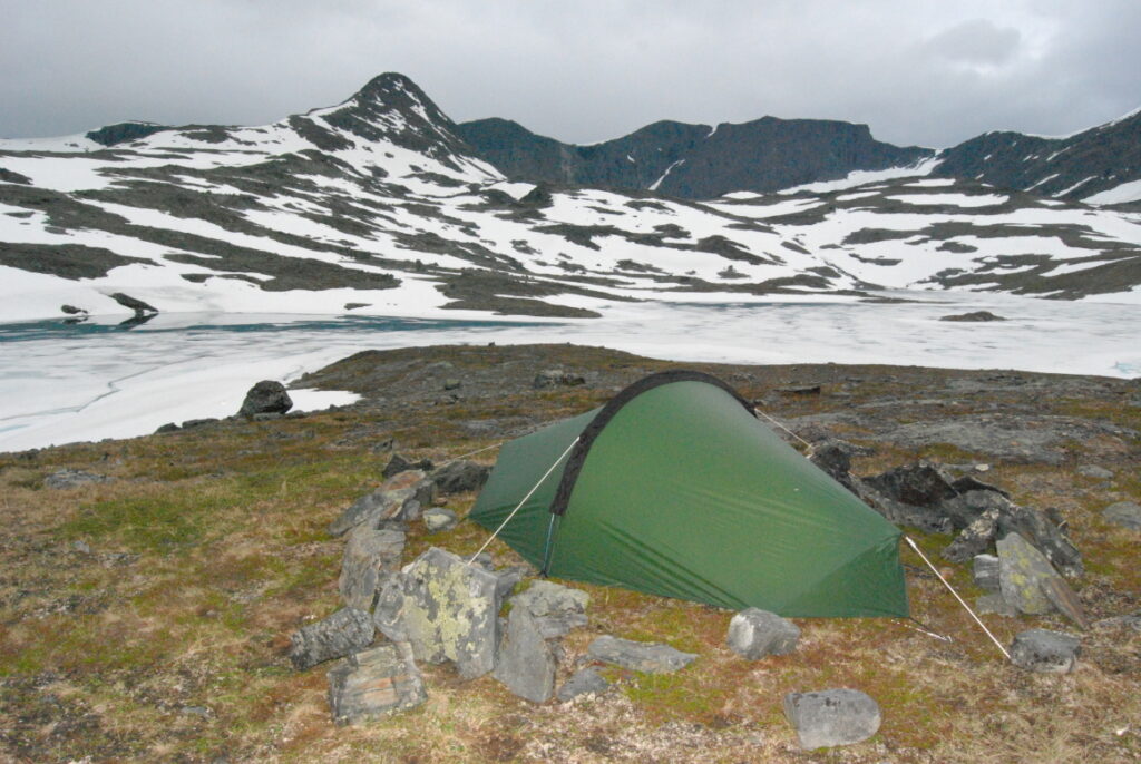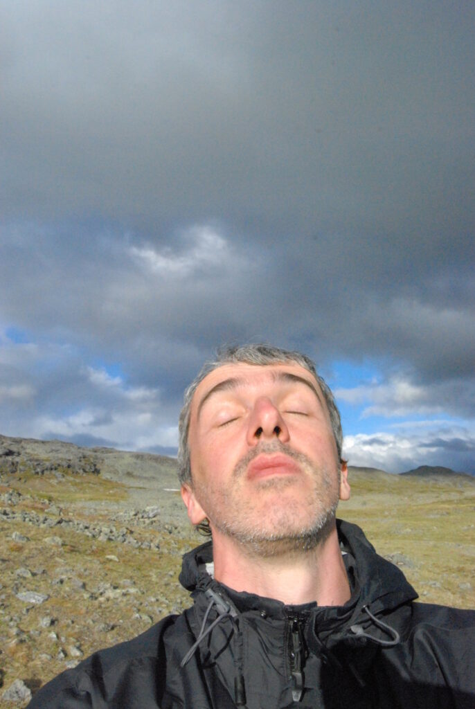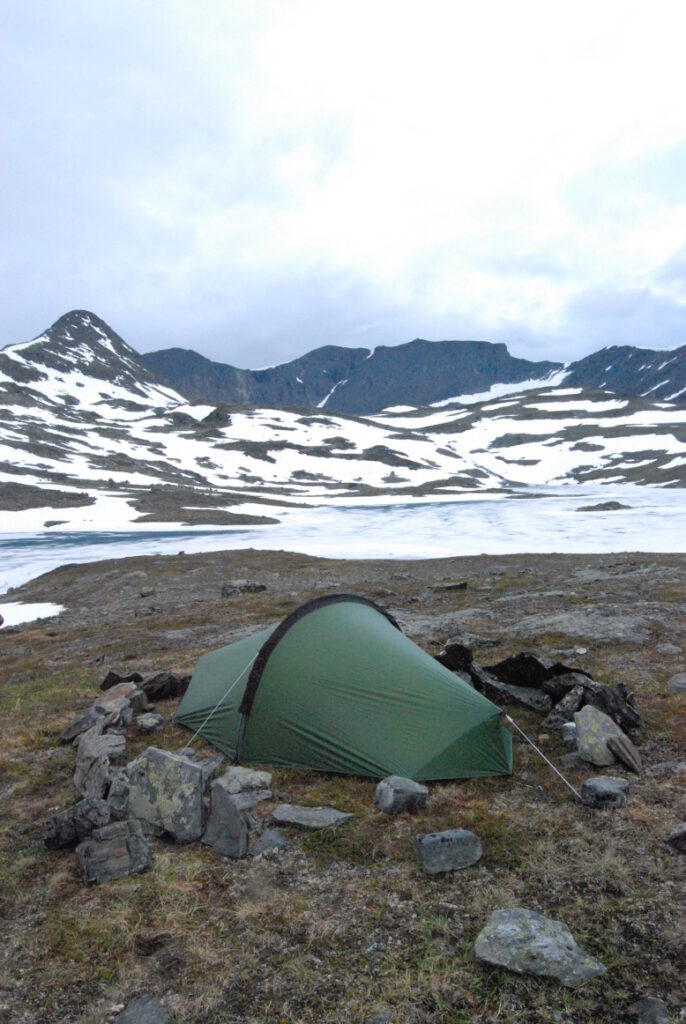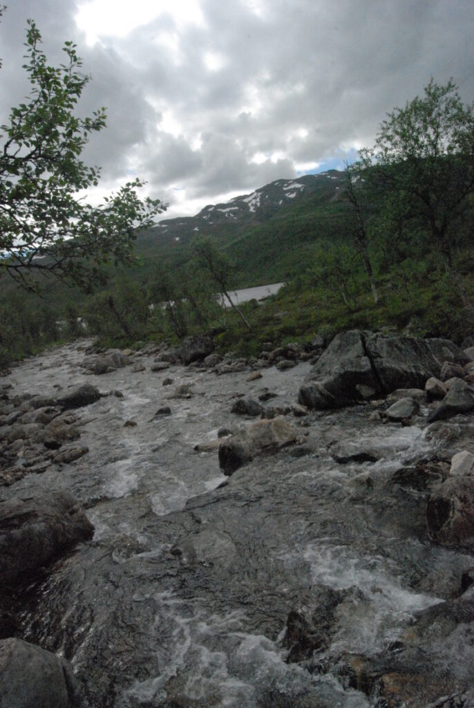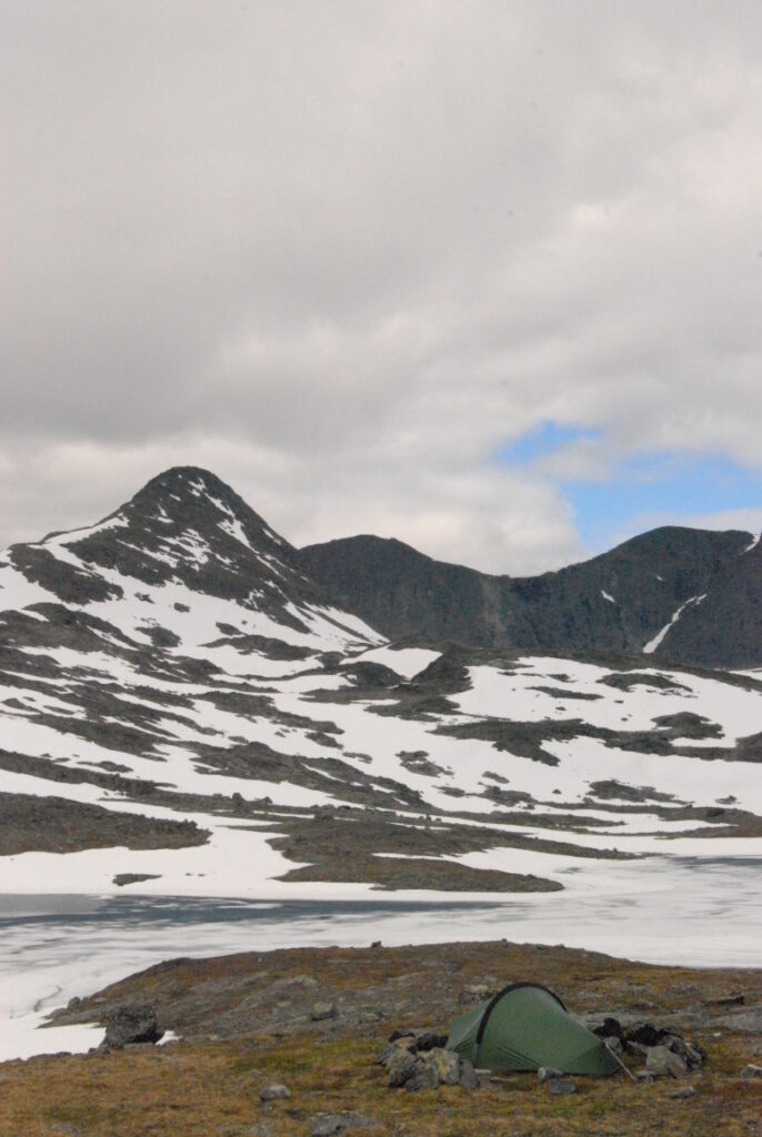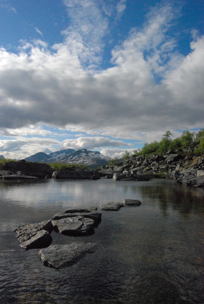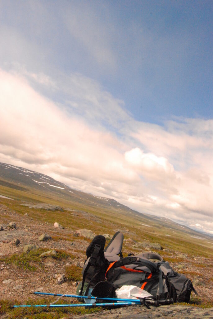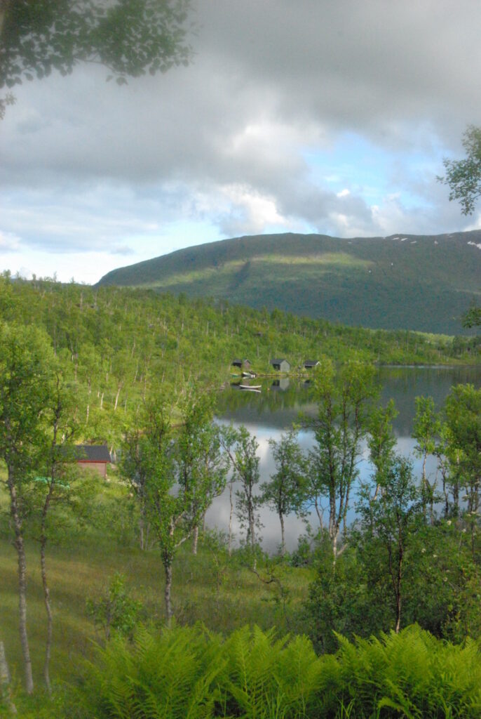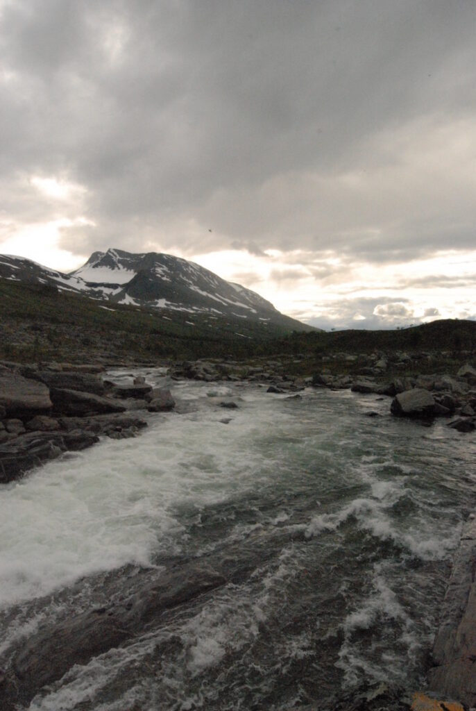 Le bus depuis Tromsø ne permet pas d’atteindre Innset, le point de départ du trek … trente kilomètres à parcourir moitié à pied moitié en stop! Il est encore tôt – vingt trois heures: je marche dix kilomètres avant de planter ma tente aux abords du lac, et la joie de découvrir en pleine lumière à trois heures du matin que les moustiques de dorment pas la nuit – il n’y a pas de nuit. Il est trois heures du matin et j’écris ce poème avant de m’endormir …
