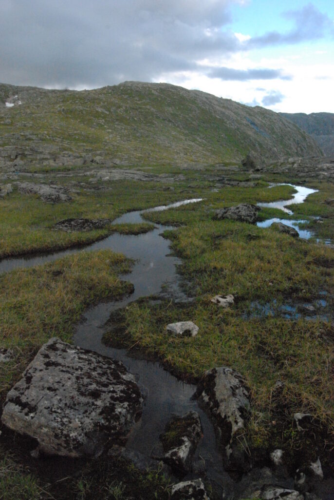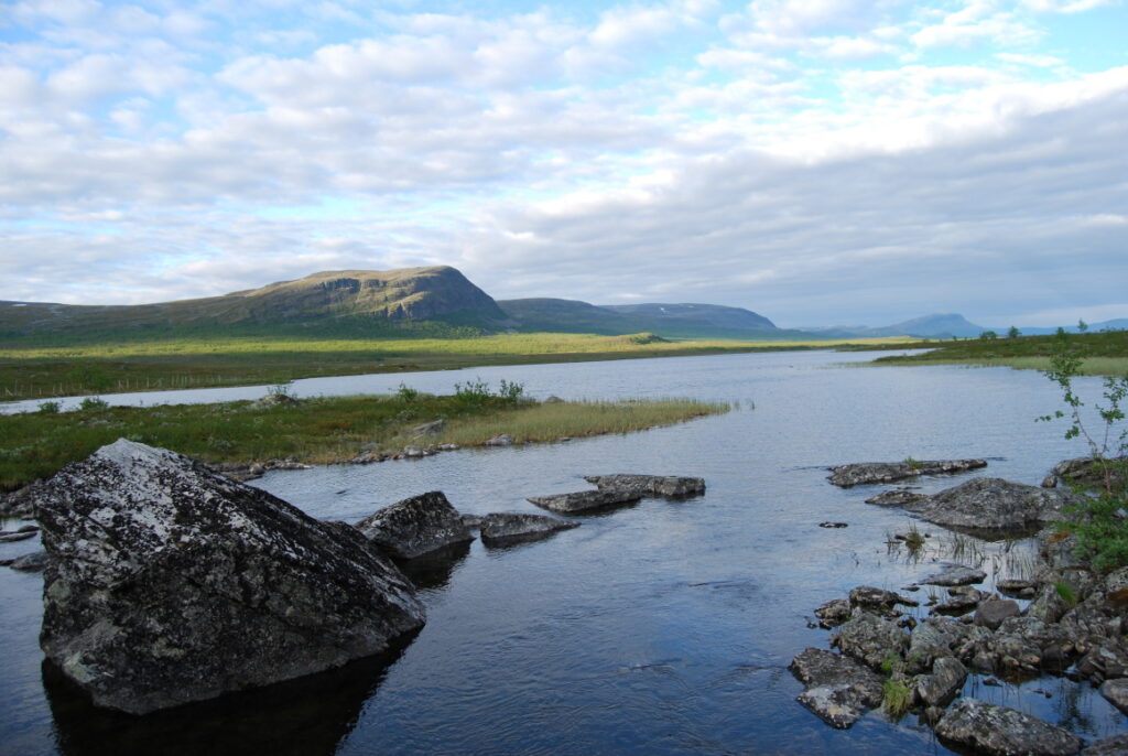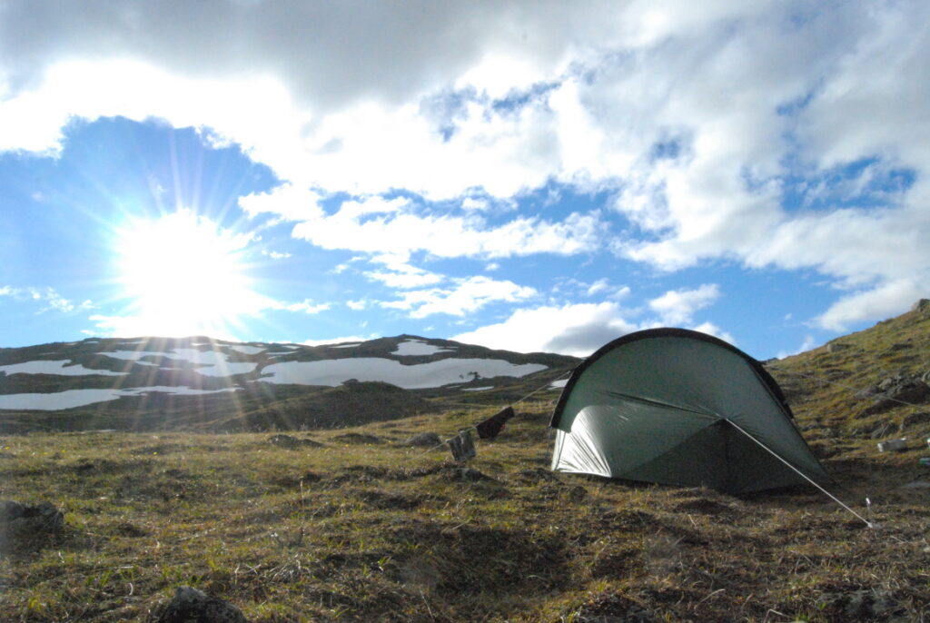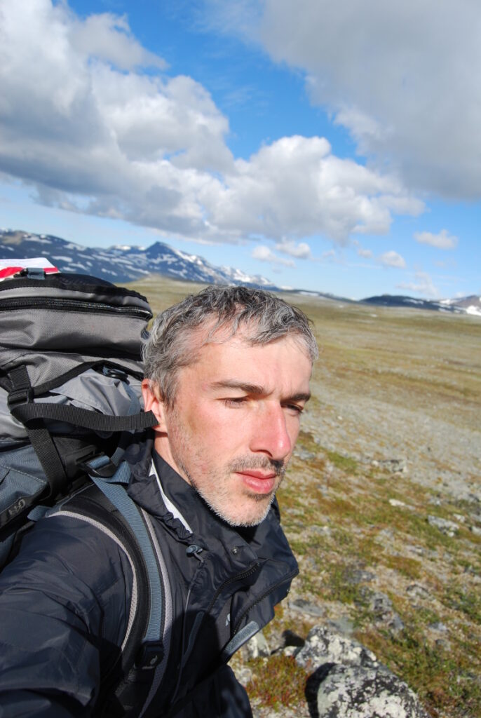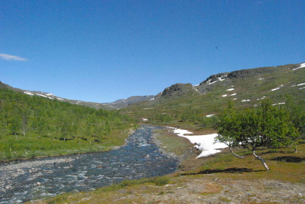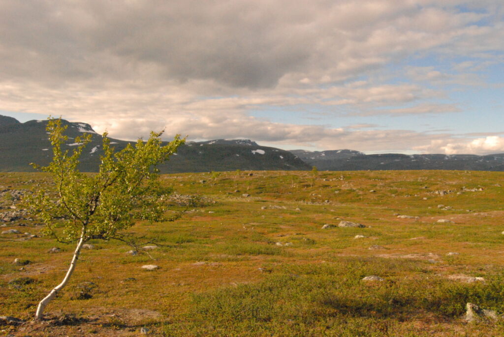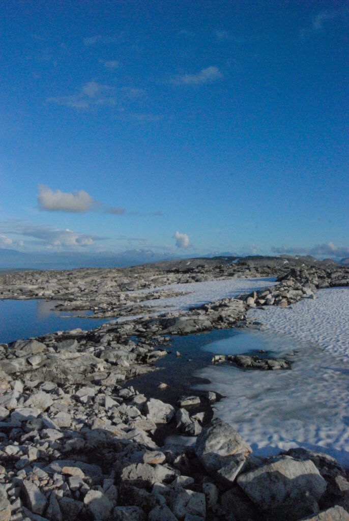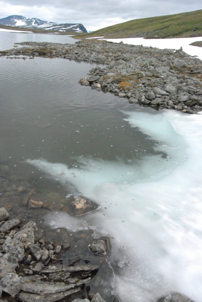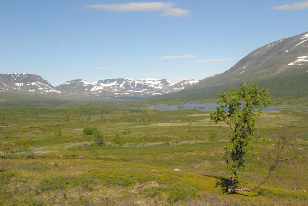 Le bus depuis Tromsø ne permet pas d’atteindre Innset, le point de départ du trek … trente kilomètres à parcourir moitié à pied moitié en stop! Il est encore tôt – vingt trois heures: je marche dix kilomètres avant de planter ma tente aux abords du lac, et la joie de découvrir en pleine lumière à trois heures du matin que les moustiques de dorment pas la nuit – il n’y a pas de nuit. Il est trois heures du matin et j’écris ce poème avant de m’endormir …