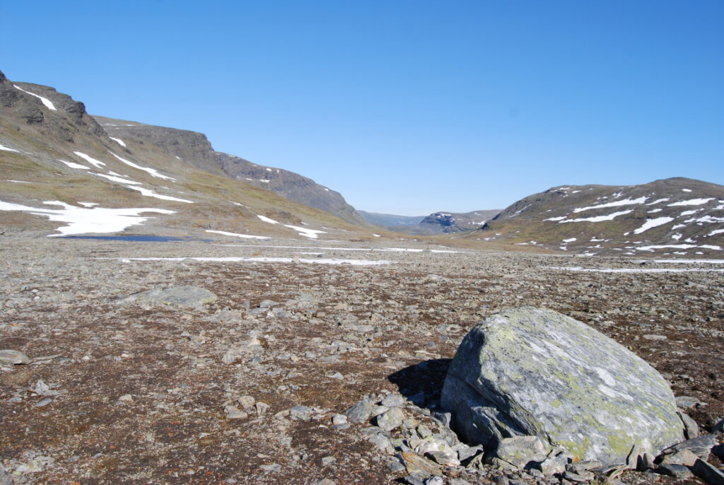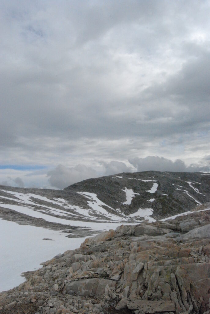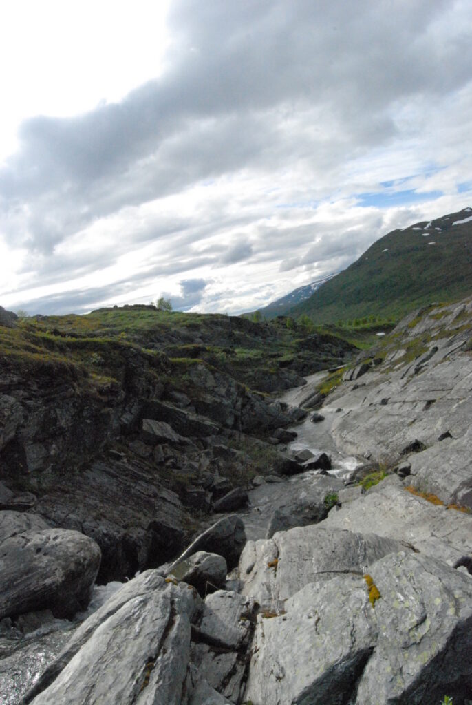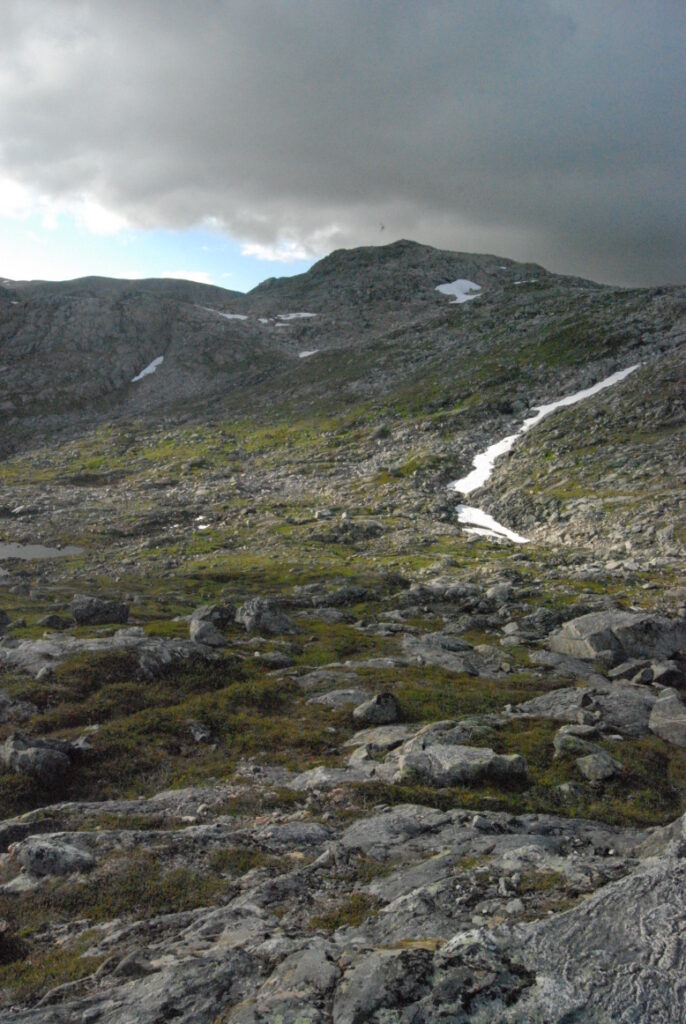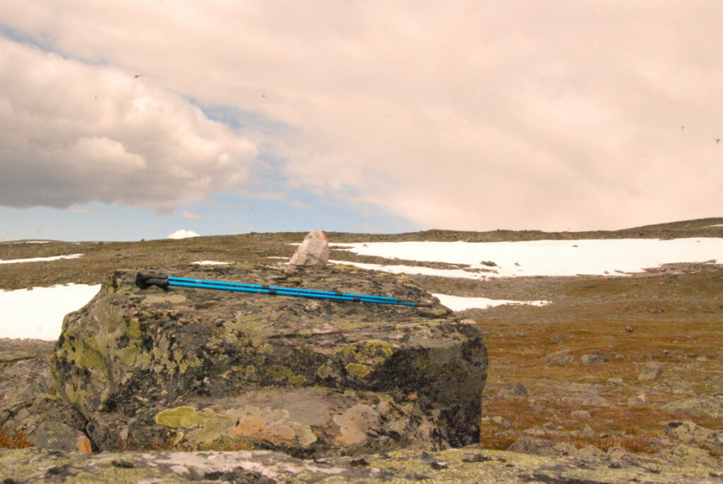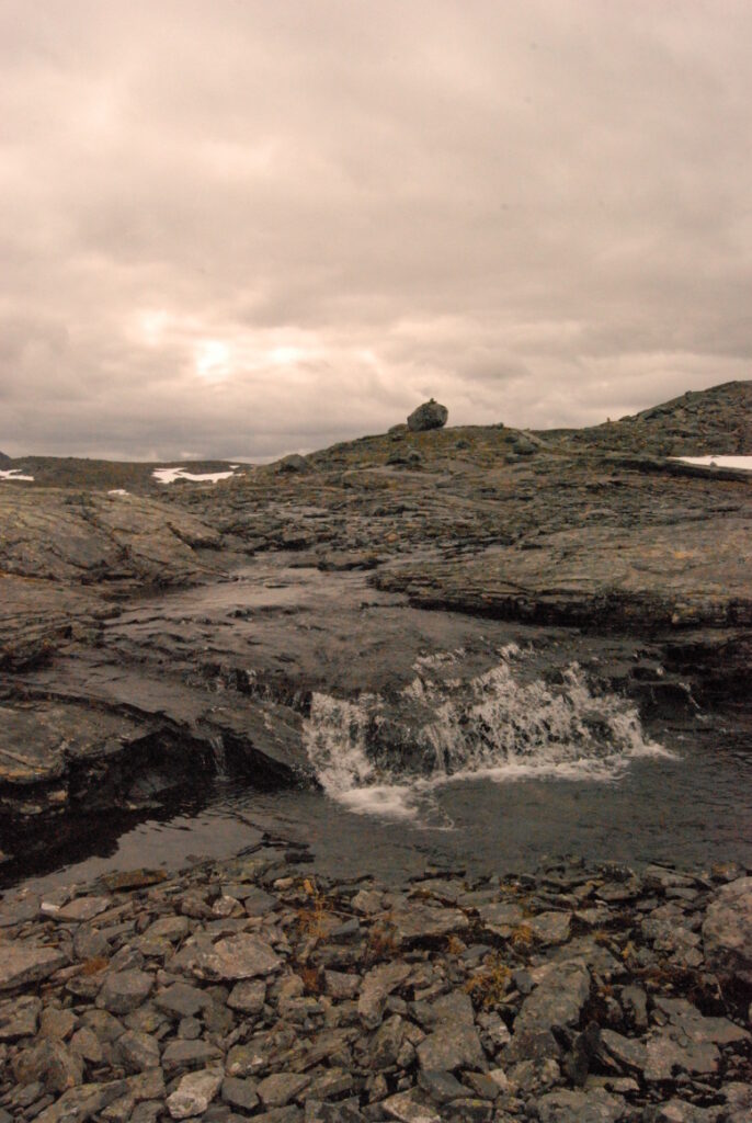 La matinée fut une longue et lente descente depuis ces neiges légères jusqu’aux landes norvégiennes en passant par de larges vallées de pierre. Curiosité: un versant de cette vallée était ponctué d’immenses blocs rocheux, comme un jeté de dés divin. Ou serait-ce des bretons producteurs de menhirs ayant exporté leurs déchets dans cette région, comme nous le faisons avec nos déchets nucléaires?