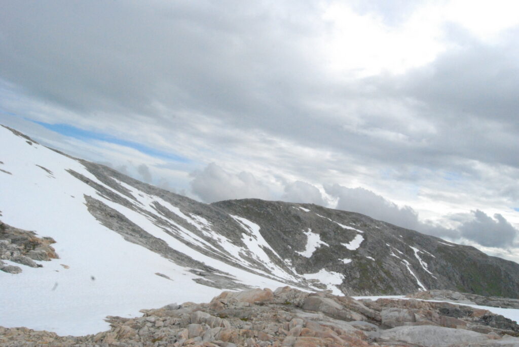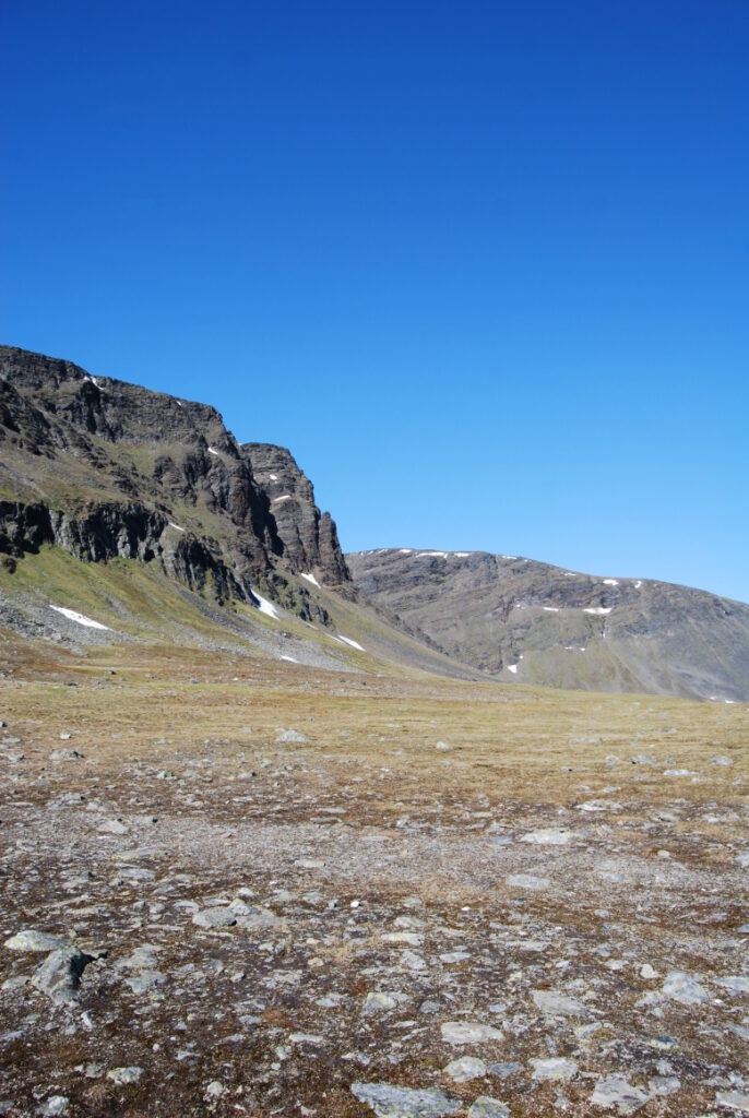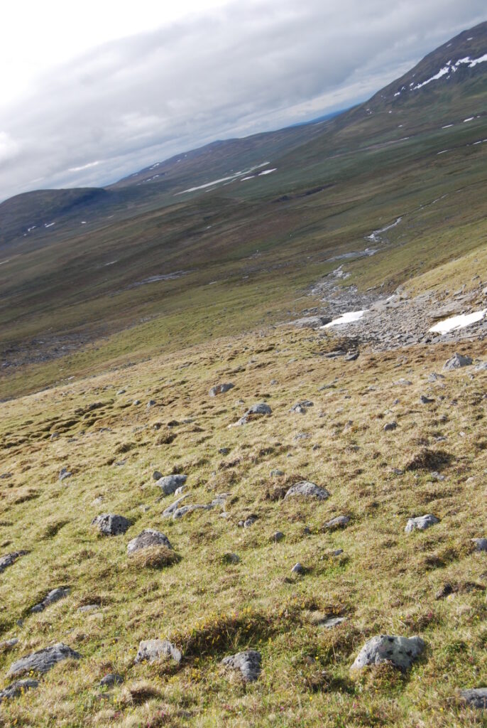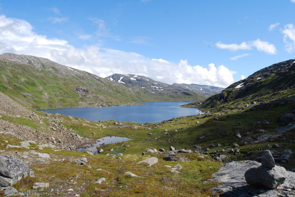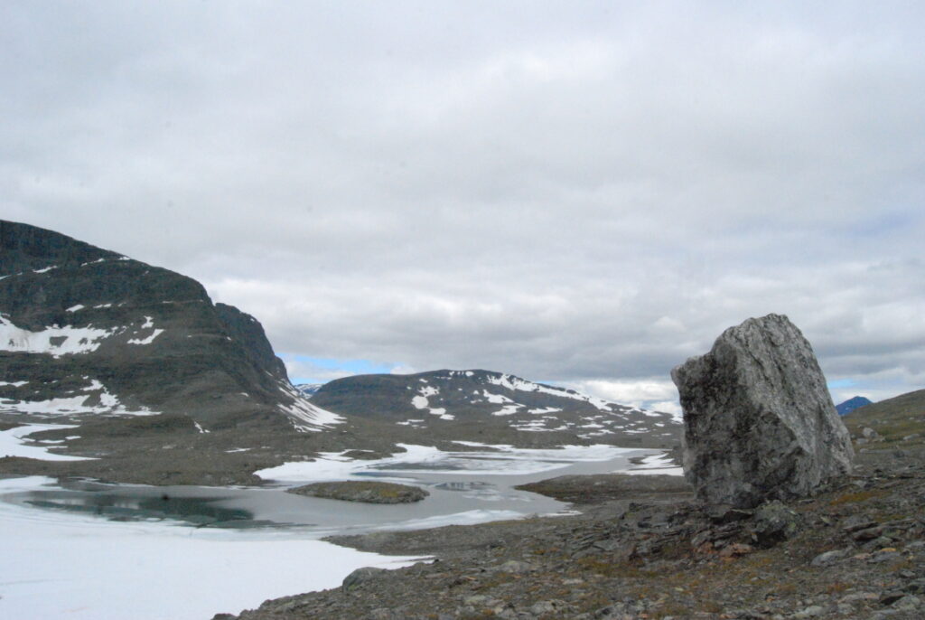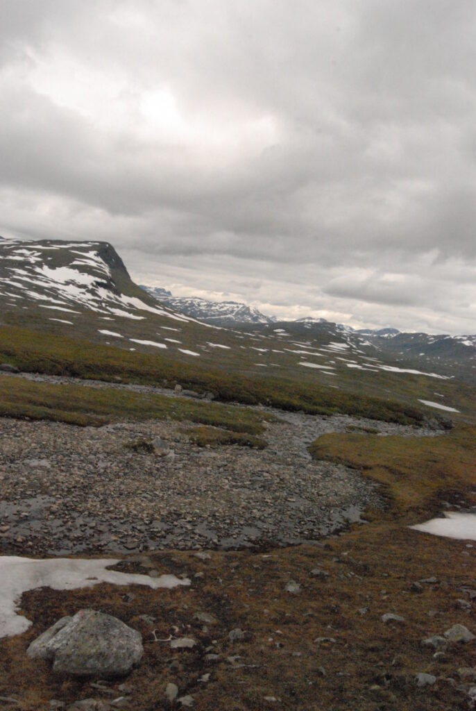 La matinée fut une longue et lente descente depuis ces neiges légères jusqu’aux landes norvégiennes en passant par de larges vallées de pierre. Curiosité: un versant de cette vallée était ponctué d’immenses blocs rocheux, comme un jeté de dés divin. Ou serait-ce des bretons producteurs de menhirs ayant exporté leurs déchets dans cette région, comme nous le faisons avec nos déchets nucléaires?