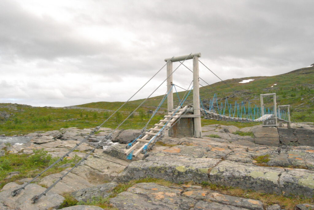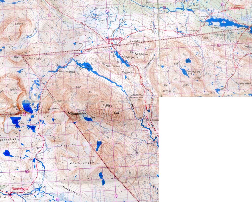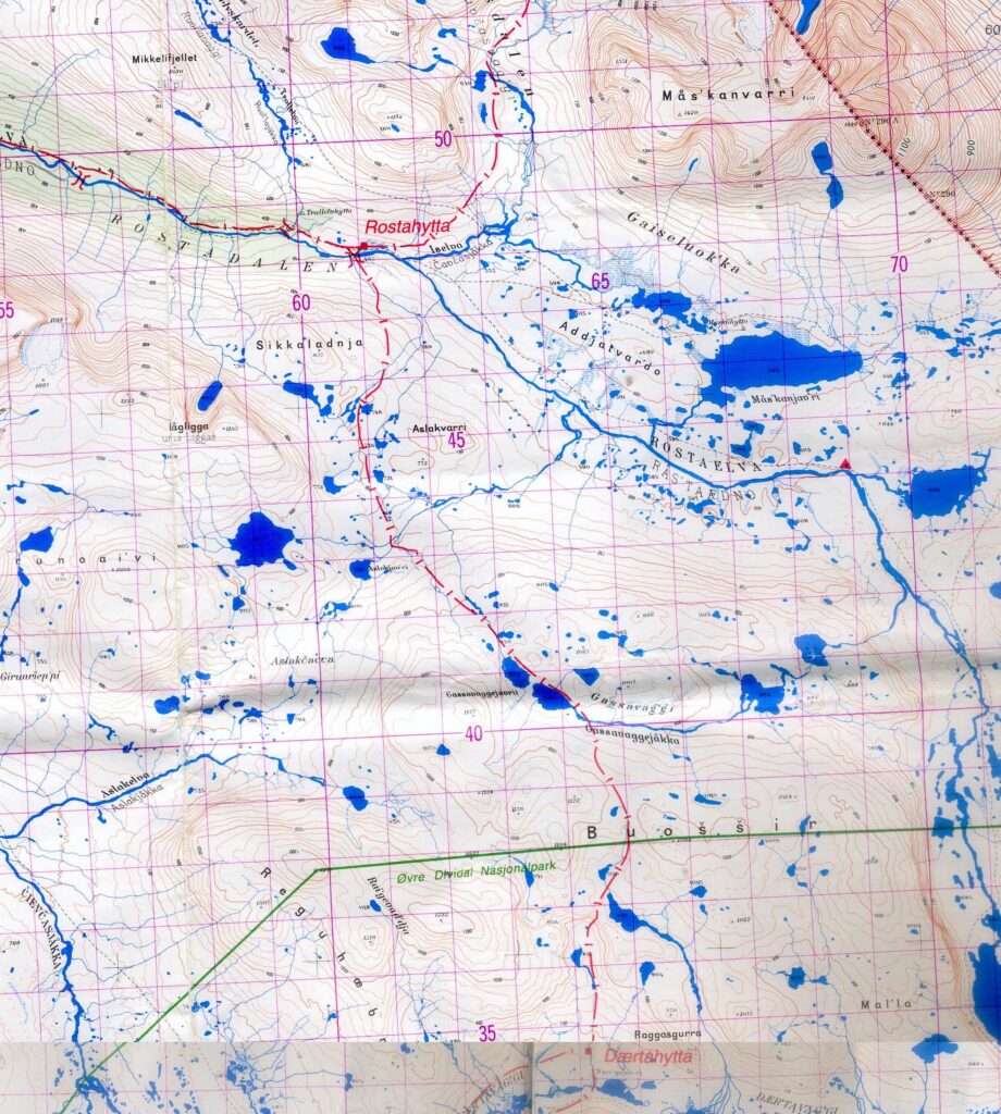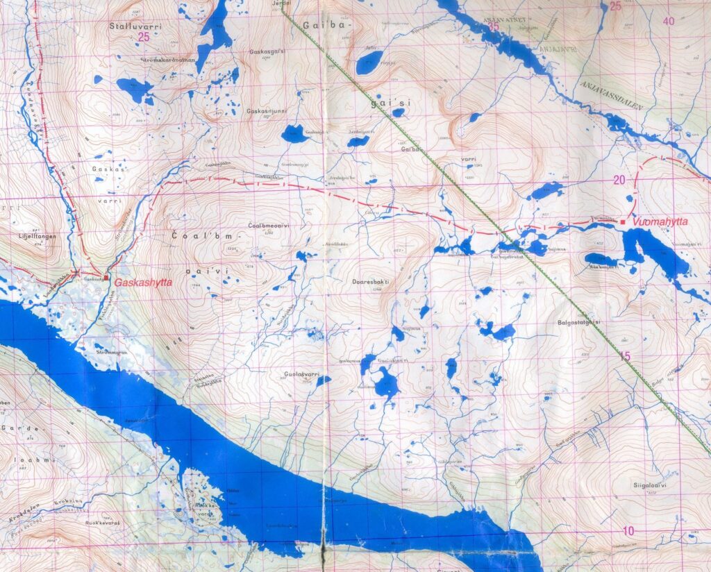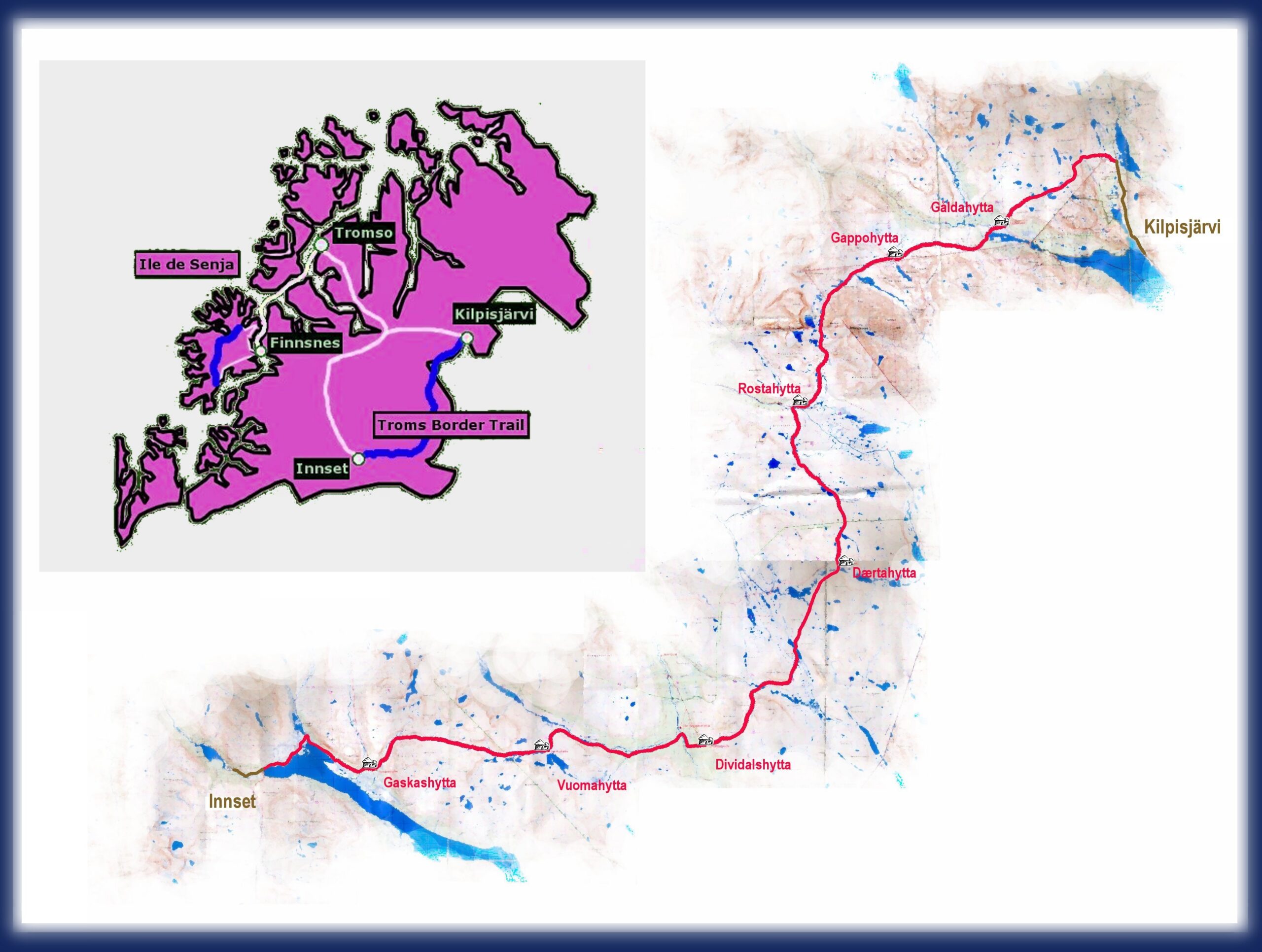 La carte ci-dessous montre les hameaux de départ et d’arrivée, et les cabanes intermédiaires. Les noms reprennent les cours d’eau ou les pics environnants suffixés de « hytta » pour signifier une hutte: Innset, Gaskashytta, Vuomahytta, Dividalshytta, Dærtahytta, Rostahytta, Gappohytta, Gåldahytta et Kilpisjärvi.