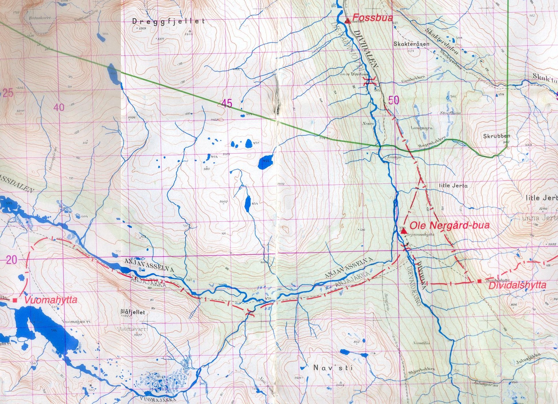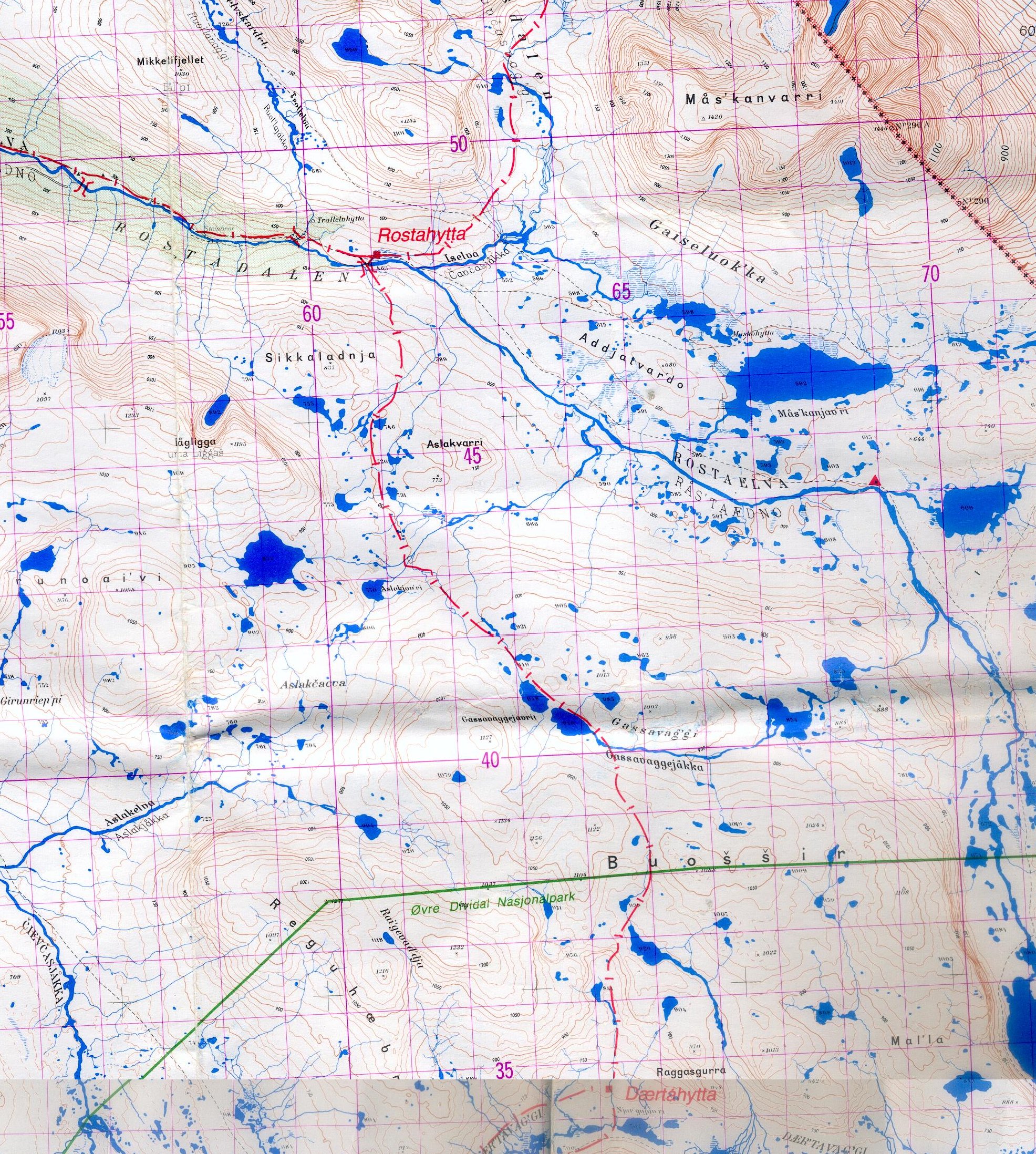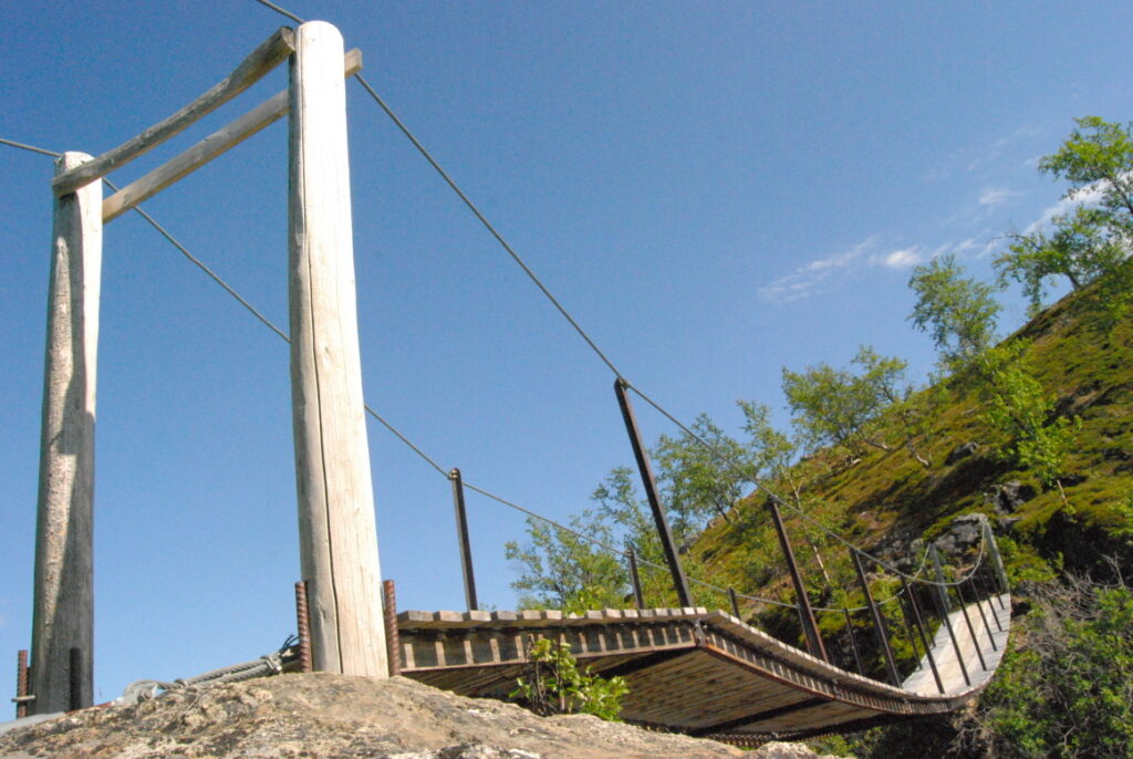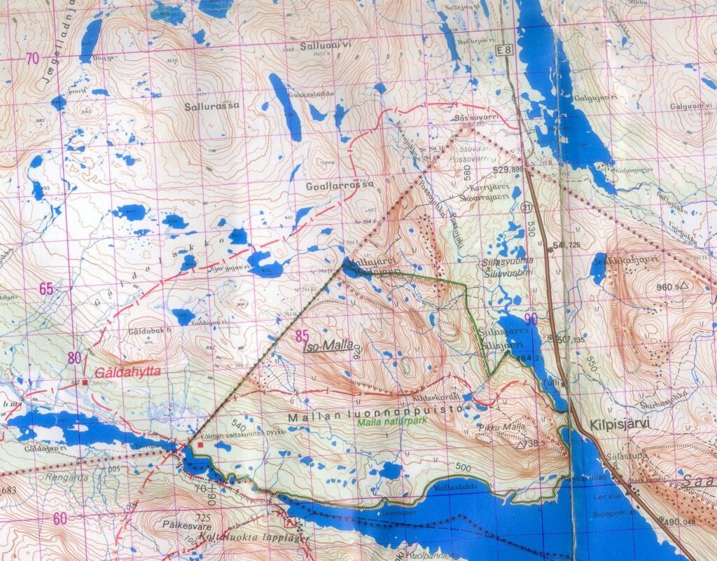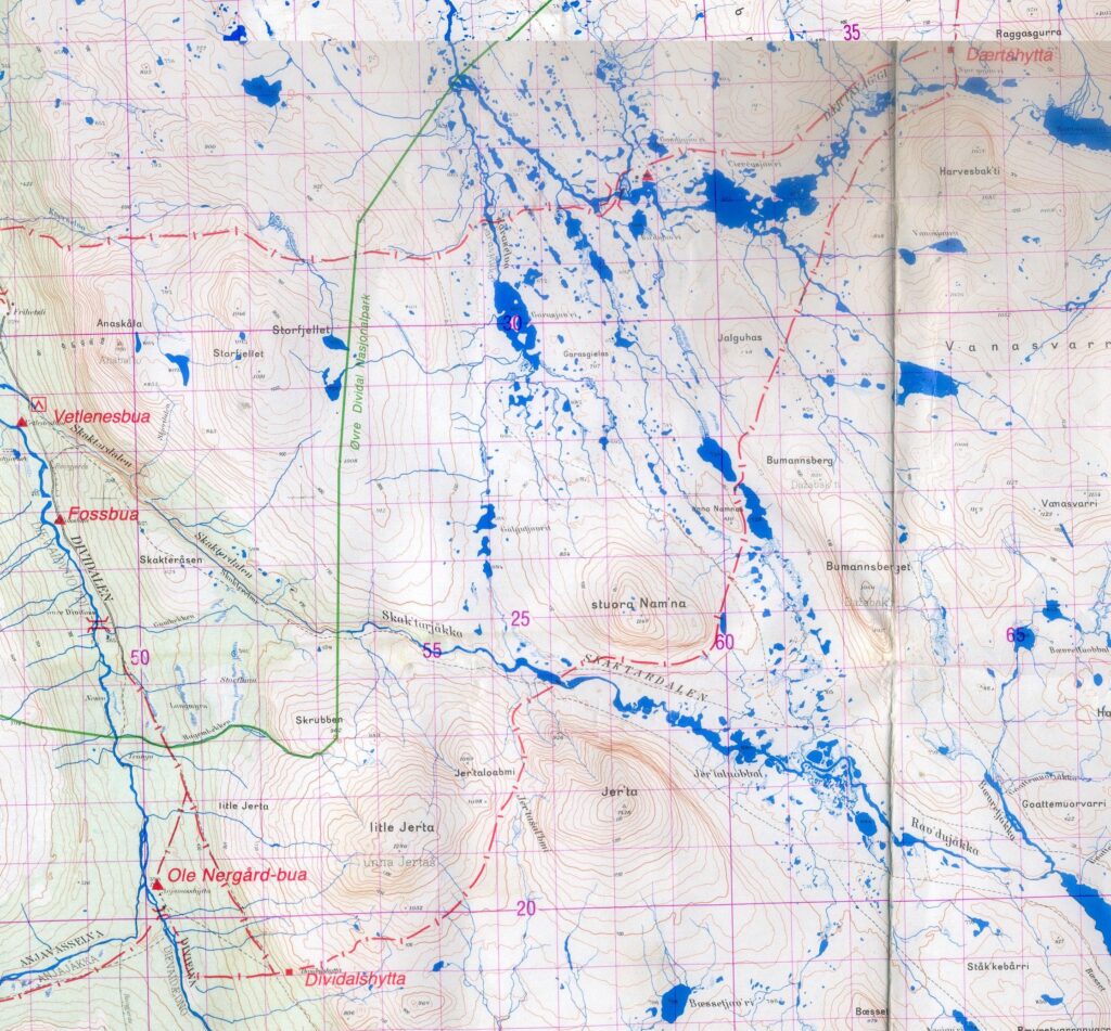 La carte ci-dessous montre les hameaux de départ et d’arrivée, et les cabanes intermédiaires. Les noms reprennent les cours d’eau ou les pics environnants suffixés de « hytta » pour signifier une hutte: Innset, Gaskashytta, Vuomahytta, Dividalshytta, Dærtahytta, Rostahytta, Gappohytta, Gåldahytta et Kilpisjärvi.