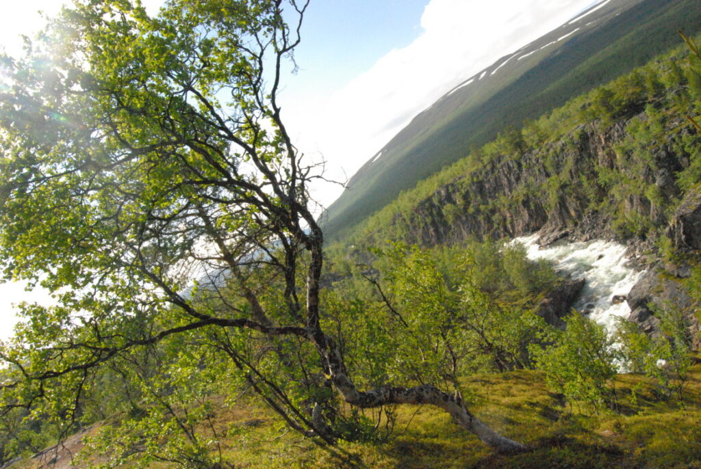 Des abords du lac, pris dans la tourbe et les forêts de bouleaux, le chemin monte jusque dans l’encaissement d’une grosse rivière …