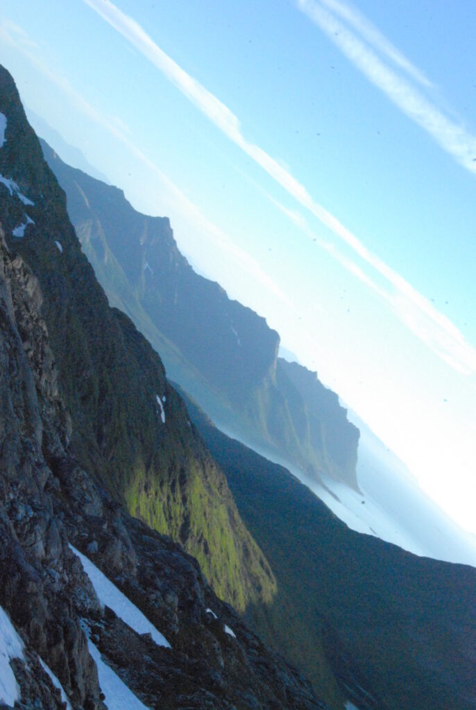 Après avoir fait les courses et mangé un pique-nique improvisé sur les marches d’une des églises de Tromsø sous l’œil impavide des mouettes, je prends le ferry – un gros catamaran filant droit au vent à coup de deux propulseurs – et je parviens ainsi à Finnsnes, aux portes de Senja. La responsable de l’Office du Tourisme est effectivement très compétente et s’adapte aisément à mon anglais difficile que je situerais entre le bafouillement de la langue d’oïl et les pointes acerbes du titi parisien. Elle me montre au mur une vaste carte obsolète de dix ans. Certains sentiers sont indiqués mais elle ne peut certifier si le balisage existe encore, voire si le sentier existe réellement. Elle désigne ainsi le plus long trek de l’île: une traversée du parc national d’Anderdalen au sud jusqu’aux fjords du nord. Etant donné les quatre jours de battement qu’il me reste, cela semble parfait et je lui dis « yes I do » comme Barack Obama dirait « Yes we can ». L’office du tourisme ne disposant d’aucune carte, je numérise des morceaux de la vieille carte. L’appareil photographique devient un des éléments le plus précieux du voyage.