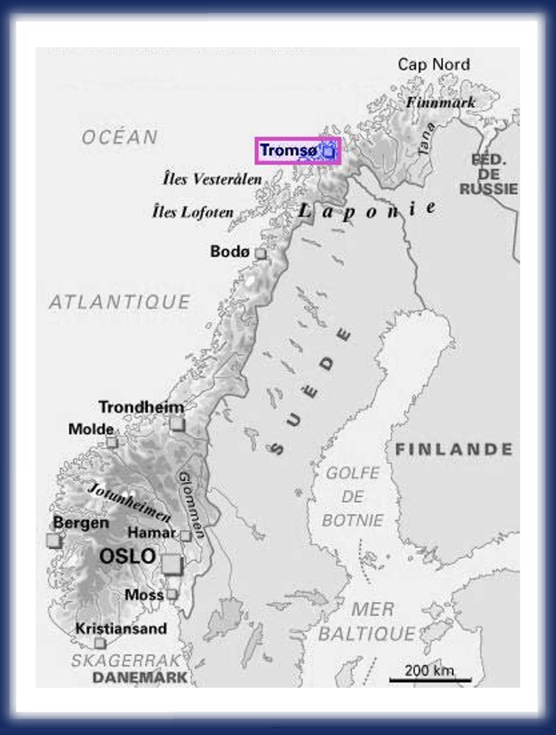 Après avoir fait le Troms Border Trail, il me reste quelques jours à passer en Norvège. Il se pose la question du « quoi faire » avec cette envie de me rapprocher des fjords, et de retourner à la mer. En parcourant le Lonely Planet, j’hésite entre les îles Olofen et l’île de Senja. Les premières sont les plus réputées, certainement les plus belles et par conséquent les plus fréquentées par les touristes. La deuxième est pour ainsi dire la villégiature des norvégiens. L’île de Senja est aussi la plus proche, à quelques encablures du ferry au départ de Tromsø. Selon le Lonely Planet, il est important de flâner dans l’Office du Tourisme de Finnsnes avant d’emprunter le pont de l’île, pour de plus amples informations.