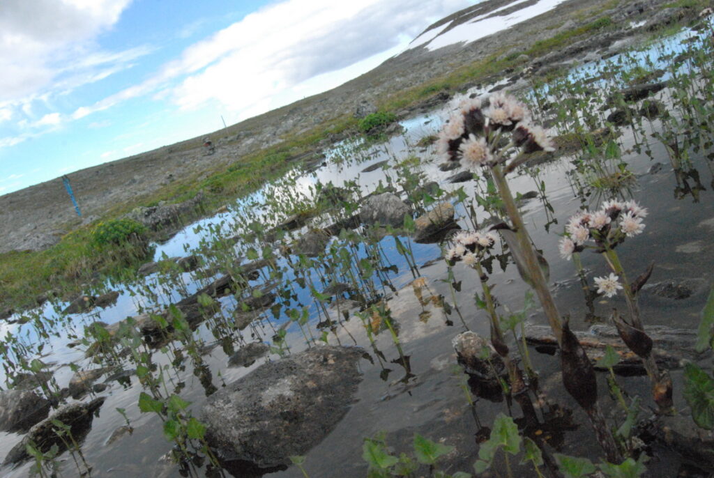 En fin de journée, éreinté, je passe derrière les cabanes de l’étape que l’on voit au loin. Les moustiques infectent les environs des cabanes et du lac voisin. Malgré la fatigue, je préfère les dépasser d’un kilomètre pour atteindre les hauteurs balayées par le vent. Les moustiques infectent les environs des cabanes et du lac voisin mais un pêcheur sans peur y passe pourtant la semaine: je me suis juré de refaire ce genre de trek avec une canne à pêche et me nourrir en tout autonomie … un rêve de trekkeur!.